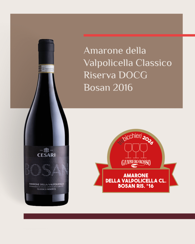 Siamo entusiasti di condividere una notizia che ci riempie di orgoglio: il nostro Amarone della Valpolicella Classico Riserva DOCG Bosan 2016 Cesari si aggiudica i prestigiosi Tre Bicchieri nella guida Vini d’Italia 2026 di Gambero Rosso.